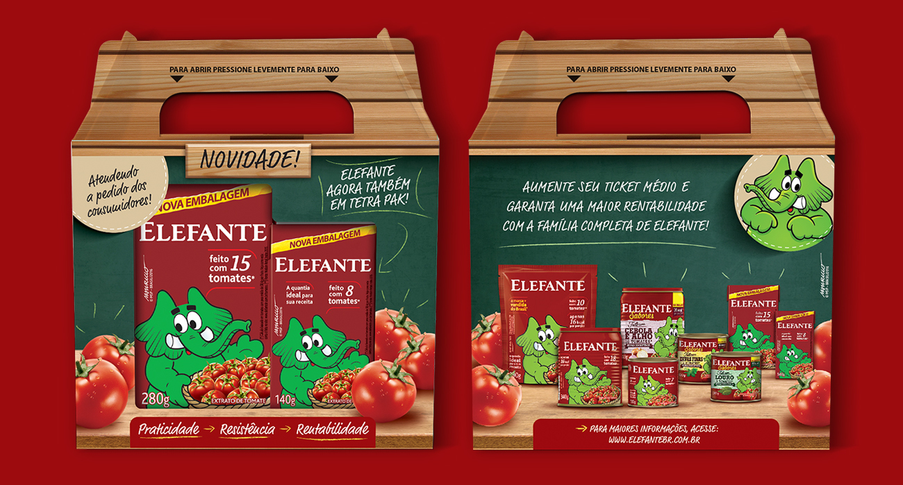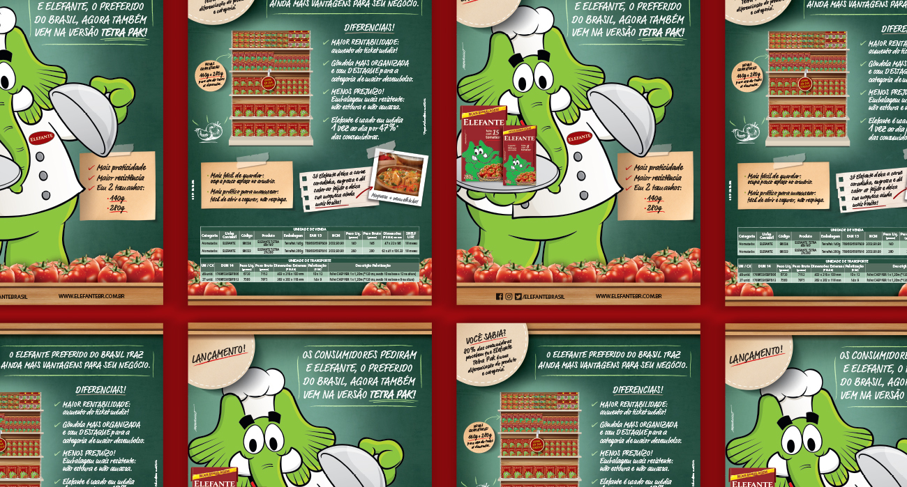 Para apoiar o lançamento das novas embalagens de extrato Elefante em formato Tetra Pak, desenvolvemos uma série de materiais estratégicos.