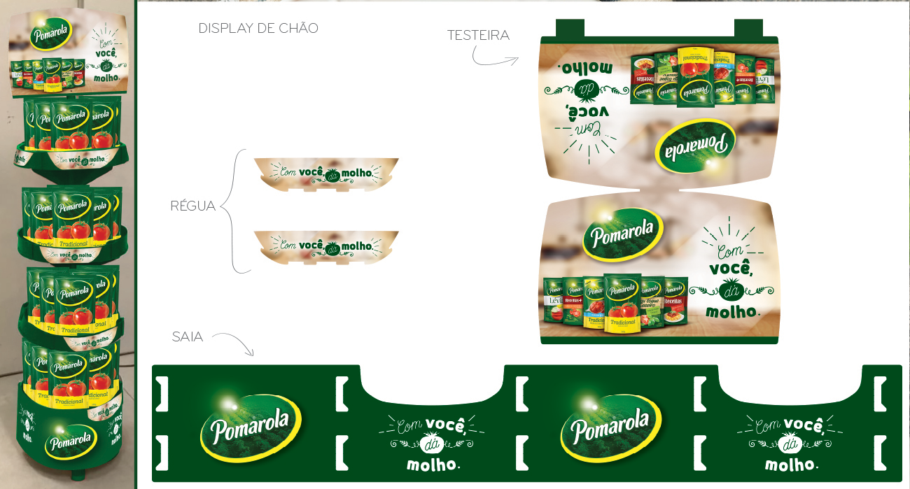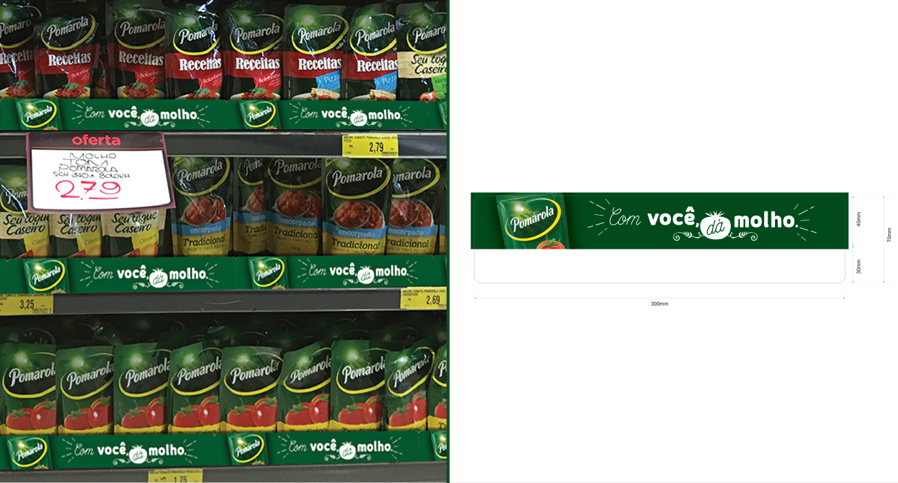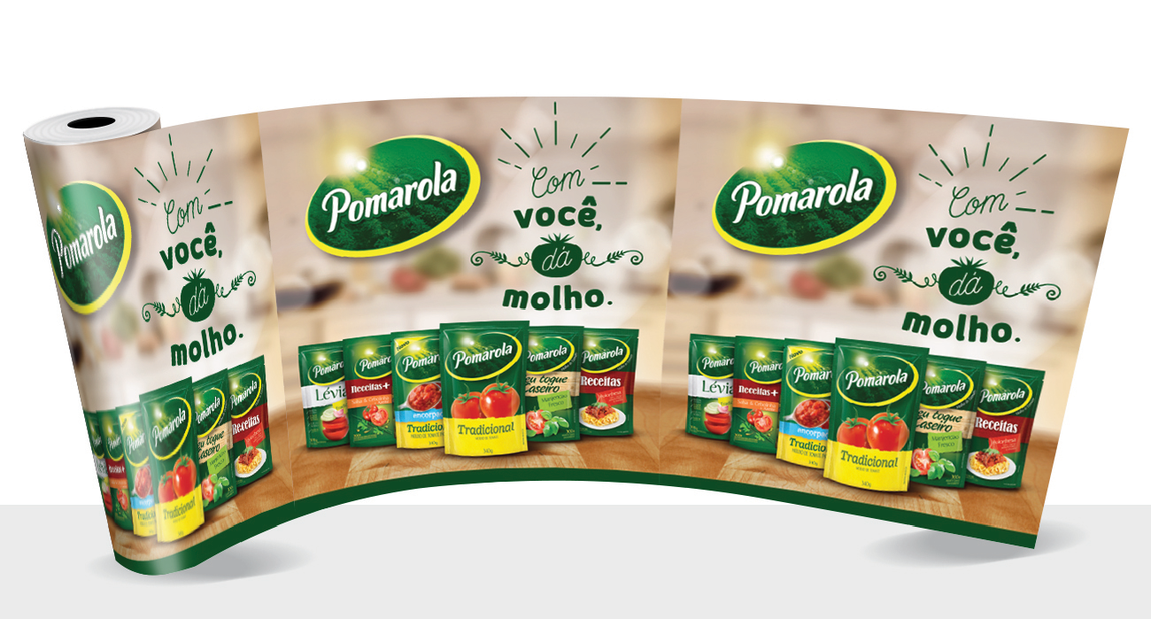 Já a bobina forração foi desenvolvida para decorar os pontos extras de exposição dos produtos Pomarola. E as cantoneiras foram projetadas para destacar os produtos Pomarola nas prateleiras, garantindo que sejam facilmente identificáveis e se sobressaiam em meio aos outros produtos.