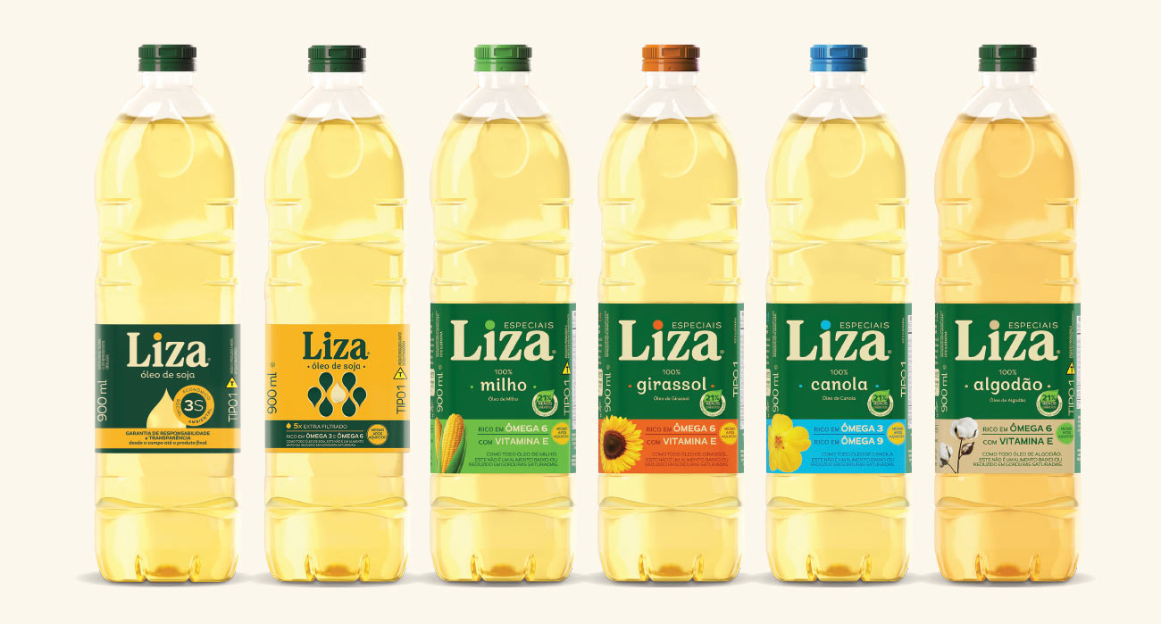 As embalagens de óleos Liza foram atualizadas com novas informações sobre sustentabilidade e aquecimento do óleo, destacando os benefícios ecológicos e nutricionais dos produtos.